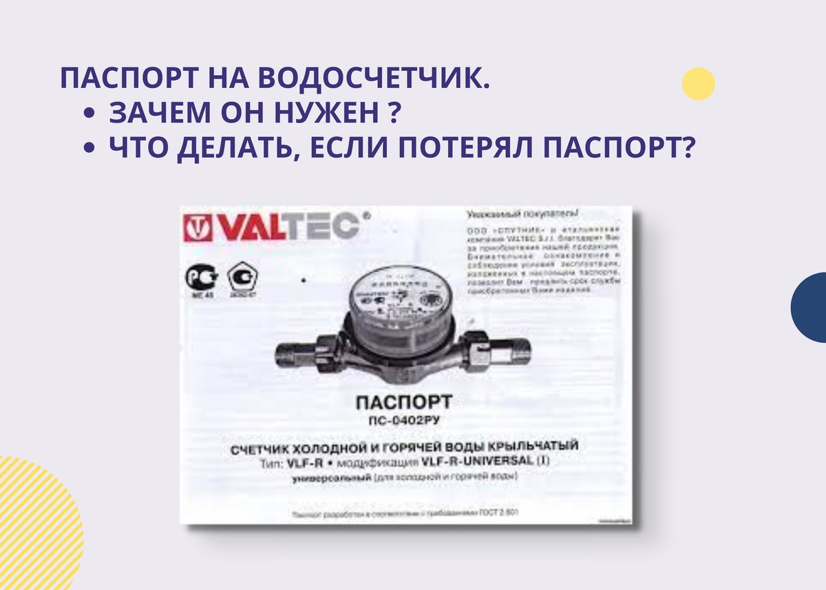 Паспорт на водосчетчик — зачем он нужен ? Что делать если потерял паспорт? Паспорт на счетчик воды является документом, содержащим информацию о сроках поверки и допустимых параметрах эксплуатации. В паспорте содержится информация: ✔ о дате выпуска прибора; ✔ о среднем сроке службы; ✔ о дате проведения первичной заводской поверки; ✔ о технических характеристиках; ✔ о наименовании и адресе производителя; ✔ о гарантийном талоне; ✔ о погрешностях измерения. Законодательство рекомендует сохранять технические паспорта на все изделия весь период эксплуатации. То есть до момента демонтажа водосчётчика. Насколько важно придерживаться этой рекомендации? На самом деле, техпаспорт сохраняет свою ценность лишь до окончания срока поверки, после чего прибор требуется поверить снова. Если по результатам поверки водосчётчик признан пригодным к использованию, то сведения о поверке и серийный номер водосчётчика вносятся в информационную систему Аршин.Именно в сведениях о поверке в системе Аршин содержитс