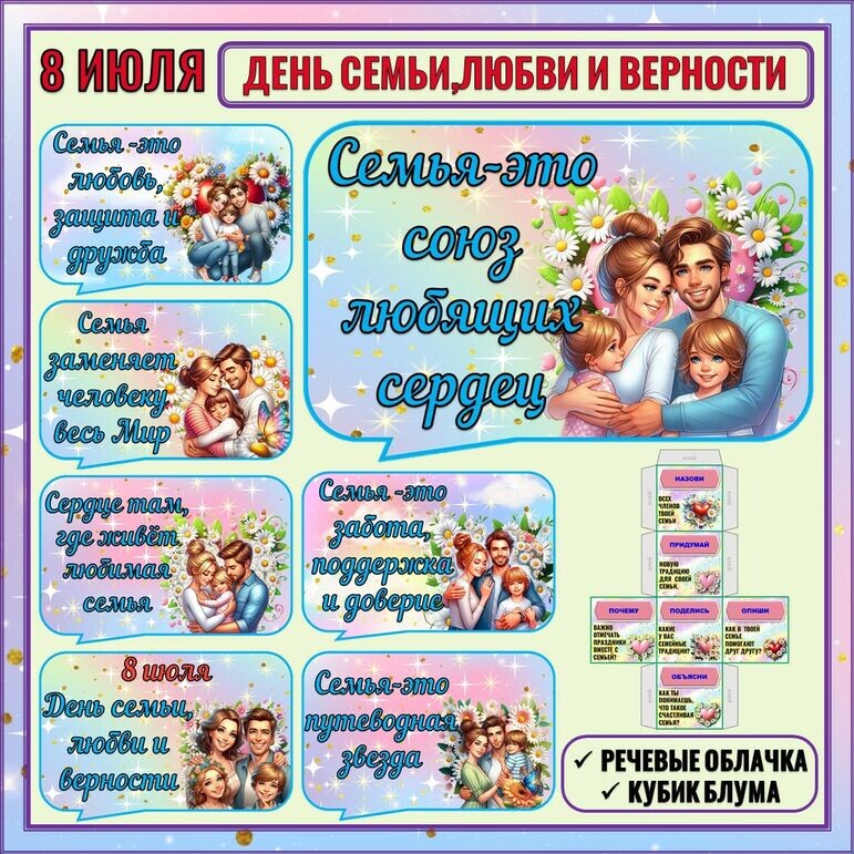 8 ИЮЛЯ "День семьи, любви и верности". ✨Речевые облачка + кубик Блума "Семья".✨ 7 ярких речевых облачков. 6 облачков с красивыми цитатами ( для оформления, фотосессии и др.) + 1 облачко с титульным листом ( 8 июля День семьи любви и верности) 1 лист А4 - одно облачко. Формат pdf. ( грань куба - 6 см) Ознакомиться и приобрести можно Здесь 👇 ДОПОЛНИТЕЛЬНО: Это может быть интересно : Речевые облачка — это наглядные материалы, содержащие цитаты, афоризмы или ключевые идеи мероприятия. Они помогают участникам лучше понять тему, запомнить ключевые моменты и создать позитивную атмосферу. Кубик Блума предназначен для облегчения процесса понимания и запоминания информации учащимися. Он состоит из шести сторон с вопросами: назови, почему, придумай, поделись, опиши и объясни. Отвечая на эти вопросы и выполняя соответствующие задания, ученики анализируют, осмысливают и усваивают материал. Рабочие листы пополняются новыми разработками, пожалуйста, отслеживайте новинки. Буду благодарна за отзывы