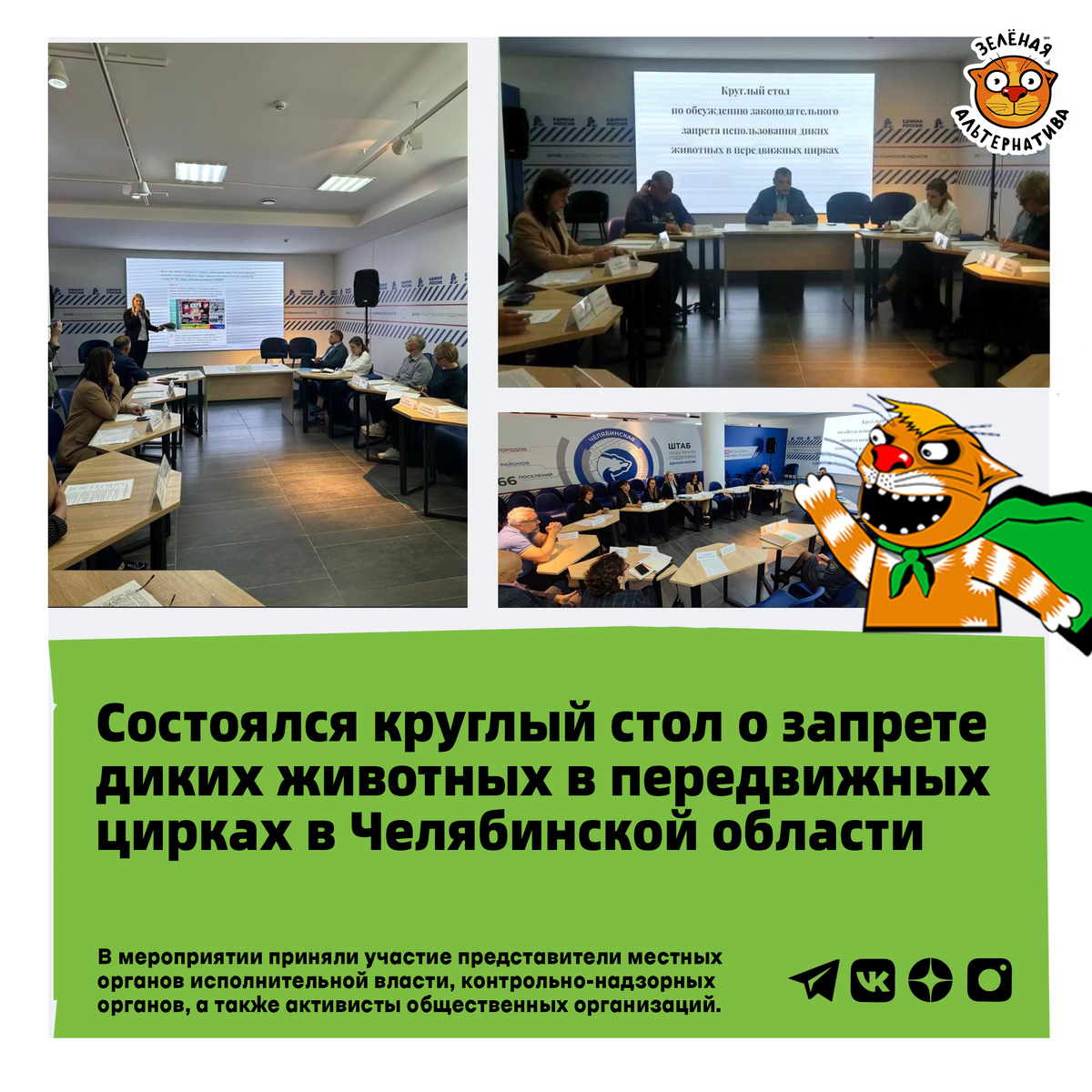 В Челябинске состоялся круглый стол, посвящённый запрету на территории региона эксплуатации диких зверей в представлениях передвижных шапито. В мероприятии приняли участие представители местных органов исполнительной власти, контрольно-надзорных органов, а также активисты общественных организаций. Встреча проходила в Штабе общественной поддержки Челябинской области. Это большое важное событие для зоозащитников всей страны.