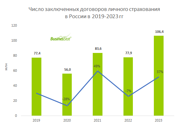 В 2023 г в России численность заключенных договоров личного страхования увеличилась на 37%: с 77,9 до 106,4 млн.