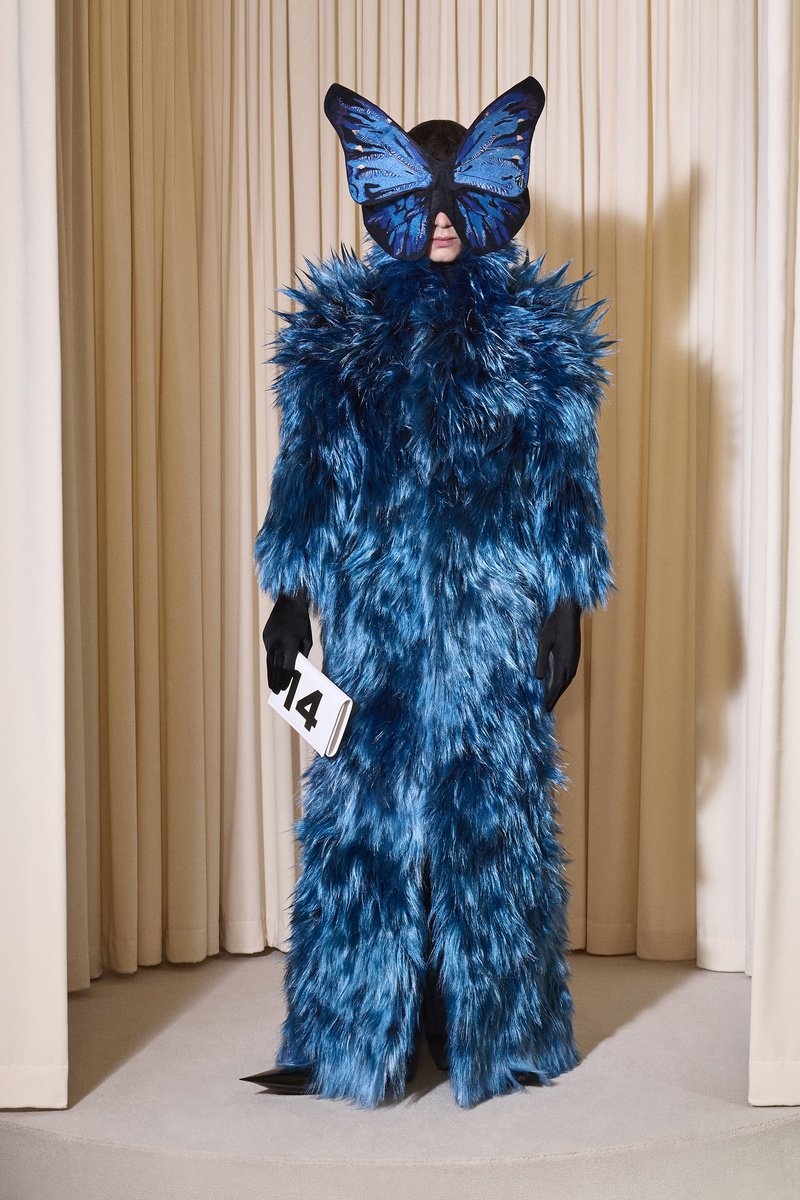 Показ Balenciaga сопровождался саундтреком из медитации с гидом. «На сегодняшнем занятии мы узнаем путь к более счастливой жизни», — сказал голос. Нам предложили дышать медленнее, представить цвет, который мы ассоциируем со счастьем, представить этот цвет облаком и «почувствовать свежий воздух и всю положительную энергию, поступающую внутрь». Гид напомнил нам, что радость — это состояние бытия, которое мы можем культивировать с помощью эмпатии и сострадания, а также отпуская негативные мысли. Это было похоже на медитацию, которую Демна слушает ежедневно. Дизайнер делает это, как он объяснил, «чтобы найти своего рода Bluetooth внутри себя к своему творчеству». Это была четвёртая коллекция haute couture креативного директора Balenciaga и самая подрывная из них в своём отказе от формальности и изысканности, типичных для этого жанра, если не считать силуэтов Кристобаля Баленсиаги. Демна позаимствовал у кутюрье рукава длиной ¾, формы кокона и elaborate headwear (сложные головные уборы), но