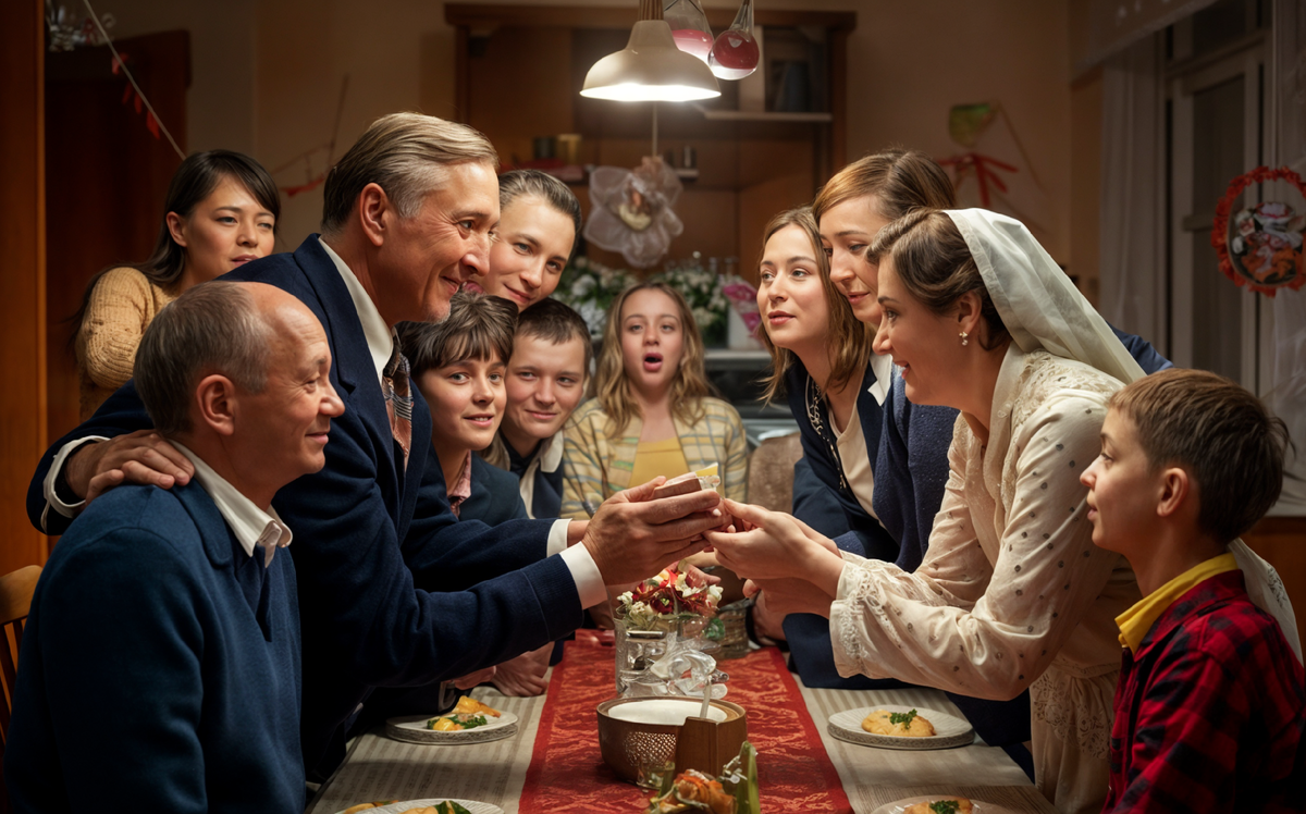 Через час семейного застолья родители, наконец, решили обменяться подарками: Мария подарила мужу очень стильные часы с золотой огранкой и путёвку в Китай.