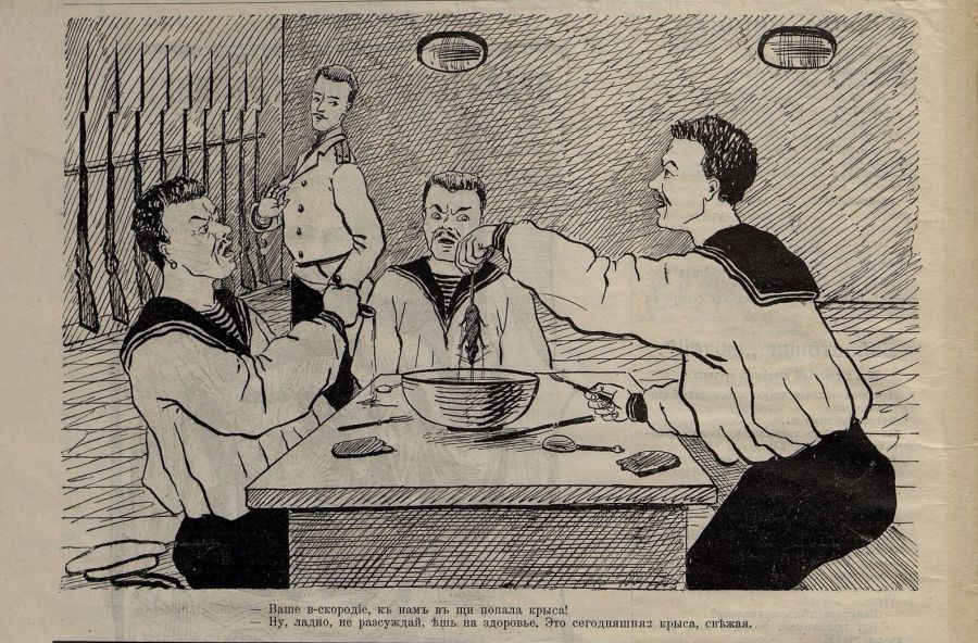 А поводом к стихийному восстанию стал обыкновенный, чисто бытовой случай: на камбузе борщ приготовили из плохого, несвежего мяса (по которому, согласно легенде, ползали черви). Как пелось в известной позднесоветской песне Льва Лещенко: