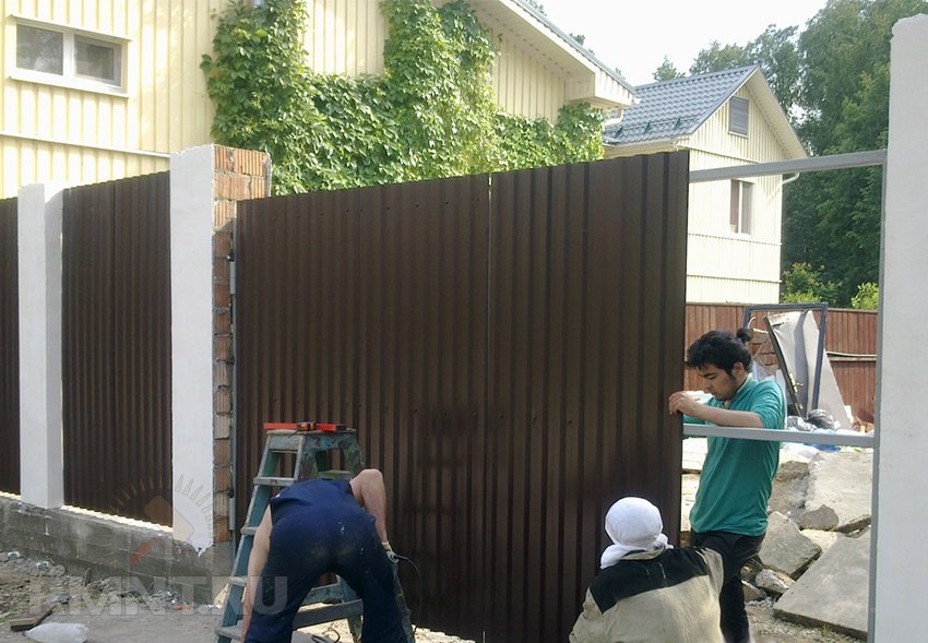 Внизу под воротами должен сохраняться такой же вентиляционный зазор, который был предусмотрен по всему забору. При нашивке листы напускаются ниже каркаса и ориентируются обрезным краем вверх. После монтажа верхний край ворот накрывается защитным угловым профилем в цвет остальному покрытию, а снизу незаметно крепится легкая оцинкованная сетка.