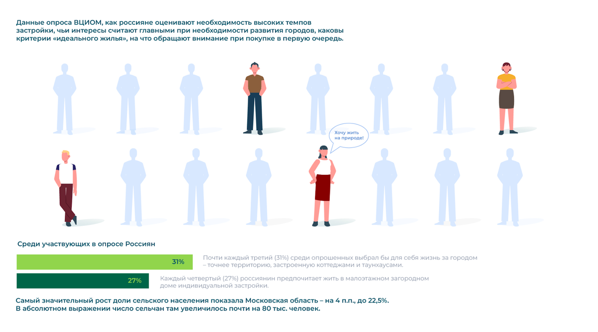 С 2020 года интерес в загородной недвижимости растет, как курс биткоина. По данным Россельхозбанка, с 2014 по 2020 год количество переехавших загород увеличилось на 400 тыс. человек. Это сравнимо с численностью населения Владимира или Белгорода. А сегодня уже 36,6 млн являются жителями сельской местности. И это только начало процесса деурбанизации, ведь почти каждый третий (31%) выбрал бы для себя жизнь за городом — точнее территорию, застроенную коттеджами и таунхаусами, сообщает ВЦИОМ.