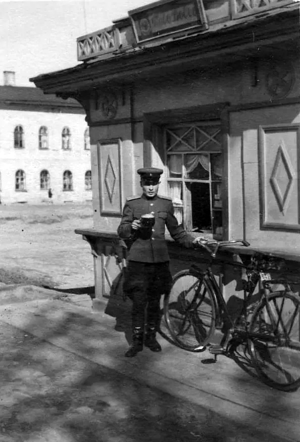 На первых двух снимках начала 1950-х, видимо два приятеля, сфотографировали по очереди друг друга у ларька с пенным. Судя по снимку гражданина в штатском, именно он был владельцем велосипеда, поскольку его штанины характерно зафиксированы, скорее всего прищепкой, чтобы не возникало казусов при езде. По характерному зданию за военным можно определить, что стоял этот ларёк прямо в центре города у перекрёстка улиц Сталина и Урицкого. Сейчас это улицы Мира и Козлёнская соответственно. Третья фотография ещё более интересная. На снимке зафиксирован самолёт УТ-2 в начале улицы Клары Цеткин 1 мая 1954 года. Сейчас это улица Благовещенская и здесь площадь перед универмагом, где нынче у нас фонтан. Собственно, снимок и сделан как раз из дома, на месте которого универмаг потом и построят. А вот если отвлечься от самолёта и посмотреть чуть выше него, то там мы как раз и увидим тот самый ларёк с пенным. В этом месте сейчас как раз пешеходный переход через улицу Мира.