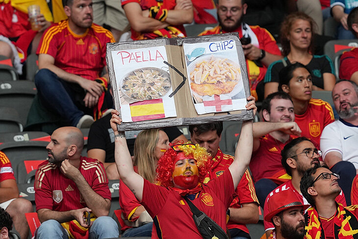 Победила Испания. Важный кадр финала: испанский болельщик дразнит англичан плакатом «Паэлья > фиш-энд-чипс». И сегодня это действительно так. Испания обыграла Англию в финале Евро (2:1). Этот чемпионт подарил нам не только множество дальних голов, но и великое кулинарное противостояние на трибунах. Еще помните гол Эмболо венграм со сползающей с ноги повязкой? Ну так вот, это не самое важное, что случилось в том матче. Швейцарский болельщик принес баннер «Фондю лучше, чем гуляш», чем не только ранил чувства Венгрии как нации, но и запустил идею в головы других болельщиков. Спасибо операторам и режиссерам трансляции, которые показали миру этого человека. И началось. «Паста лучше паэльи» на матче Италия – Испания. «Колбаса лучше сыра гауды» на матче Польша – Нидерланды. Венгры, обиженные на гуляш, попытались взять реванш в крепких напитках. «Палинка лучше виски» на матче Венгрия – Шотландия. Эту лавину не остановить. «Свичкова на сметане лучше кебаба» (Чехия – Турция), «Сыр комте лучше сы