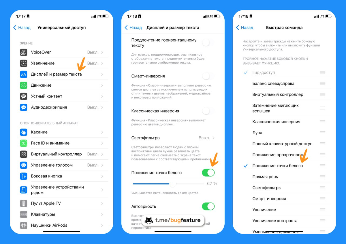 Теперь при тройном нажатии боковой кнопки на iPhone с Face ID (или кнопки «Домой» на iPhone с Touch ID) будет активироваться настроенный режим пониженной яркости дисплея.