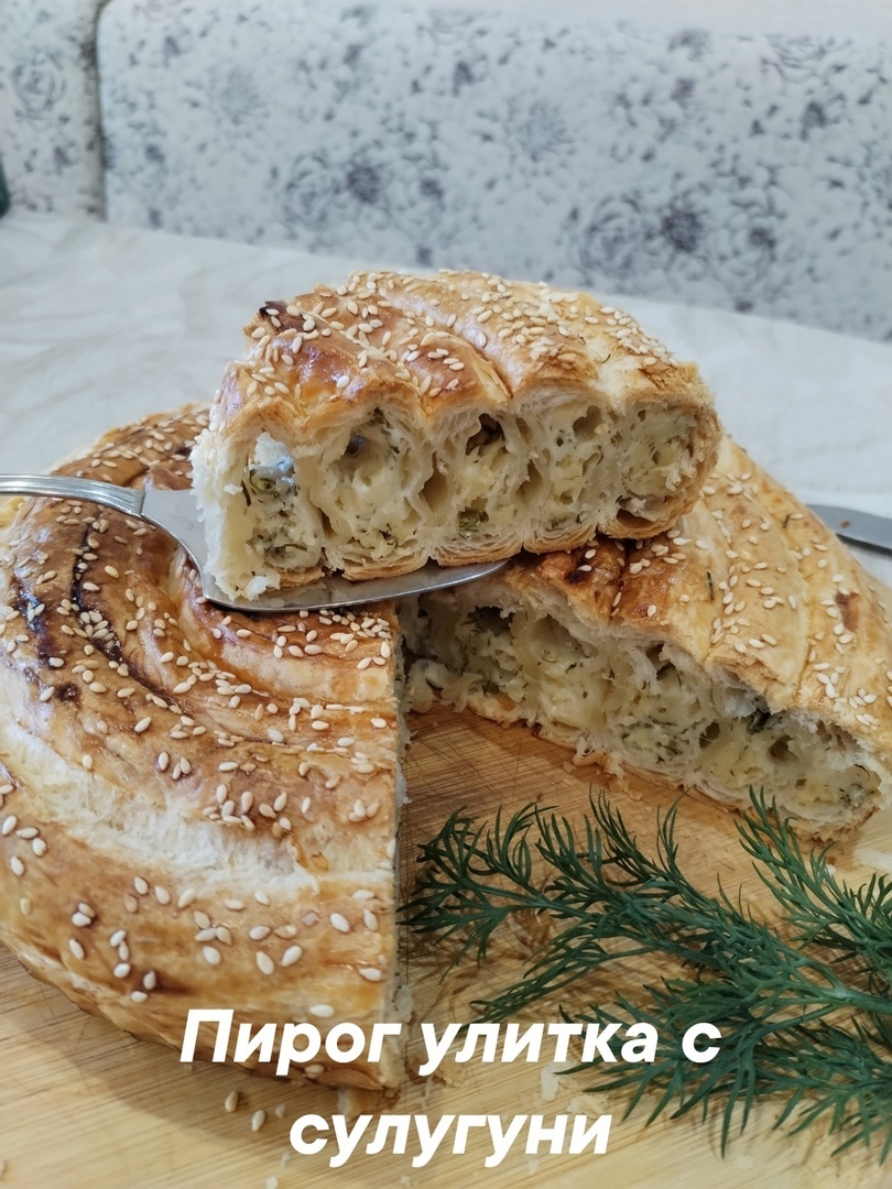 Ингредиенты: тесто слоеное- 500 гр. сыр сулугуни- 300 гр. брынза -100 гр. пучок зелени яйцо - 1 штука на смазку и желток в тесто кунжут Приготовление: Готовое бездрожжевое слоеное тесто разморозить, разрезать на 4 полоски. Раскатать каждую полоску длиной (примерно 7*30 см). Сыр натереть на крупной терке, брынзу размять вилкой. Все перемешать, добавить желток, нарезанную зелень ( у меня укроп). Распределить равномерно всю начинку на все 4 раскатанные полоски по центру. Края защипнуть. Дно формы для запекания застелить пергаментной бумагой. Укладываем наши трубочки-заготовки в разъёмную форму, закручивая по спирали вплотную друг к другу создавая форму улитки. Готовую улитку смазать взбитым яйцом, посыпать верх кунжутом и поставить в разогретую духовку выпекать. Выпекаем при 180 градусов цельсия на 40 минут.