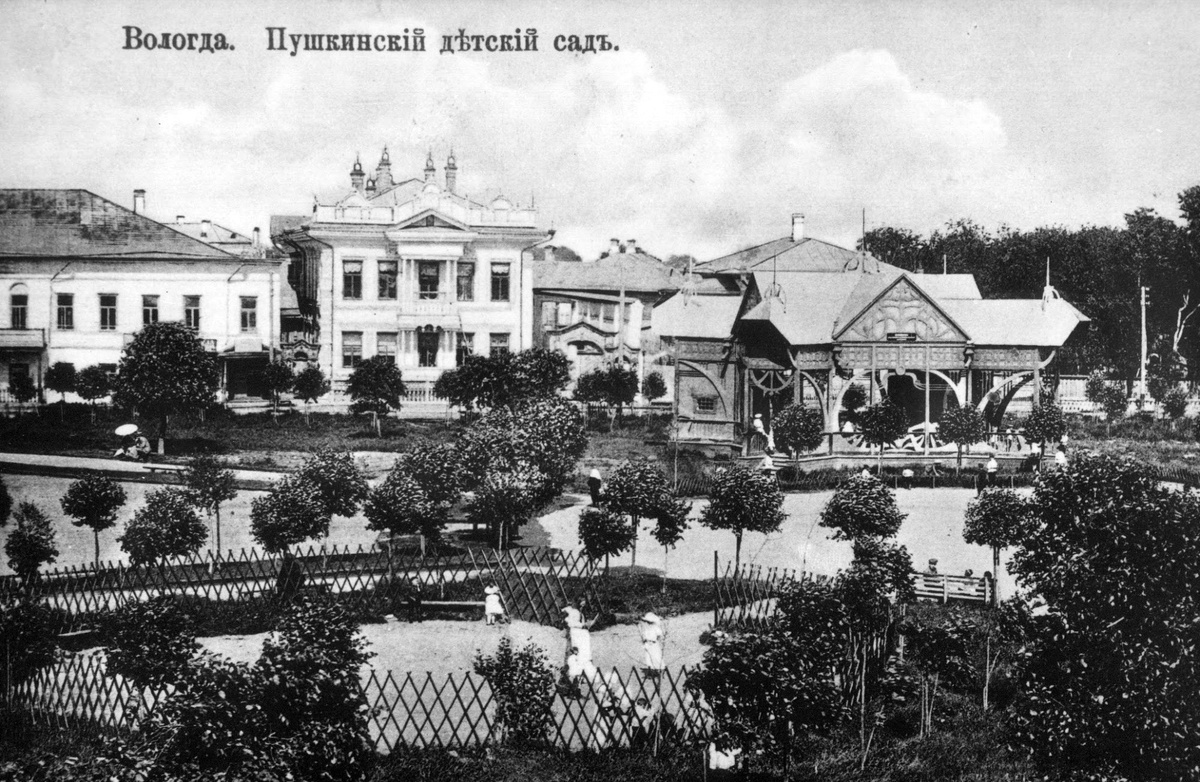В марте 1908 года на заседании общества помощи нуждающимся учащимся был поднят вопрос об устройстве в городе садика для детских игр. Была создана специальная комиссия для решения данного вопроса, возглавил которую депутат Вологодской городской думы Владимир Иванович Свешников. Местом для размещения садика был выбран Пушкинский сквер (район современной площади Революции). Пригласили опытного садовника, который наметил план садика и в мае 1908 года приступили к его обустройству. В центре садика была сделана круглая площадка для игр диаметром в 20 саженей (почти 42,5 метра), к которой с четырёх сторон подходили дорожки. Для устройства площадки и дорожек потребовалось большое количество извести, щебёнки и песка. Известь была доставлена с кожевенных заводов, а песок покупался исключительно у крестьян и по довольно высокой цене, около 2 рублей за один кубометр, так как время для доставки песка было самое неподходящее и крестьяне с трудом согласились возить песок даже по такой цене. Так же бы