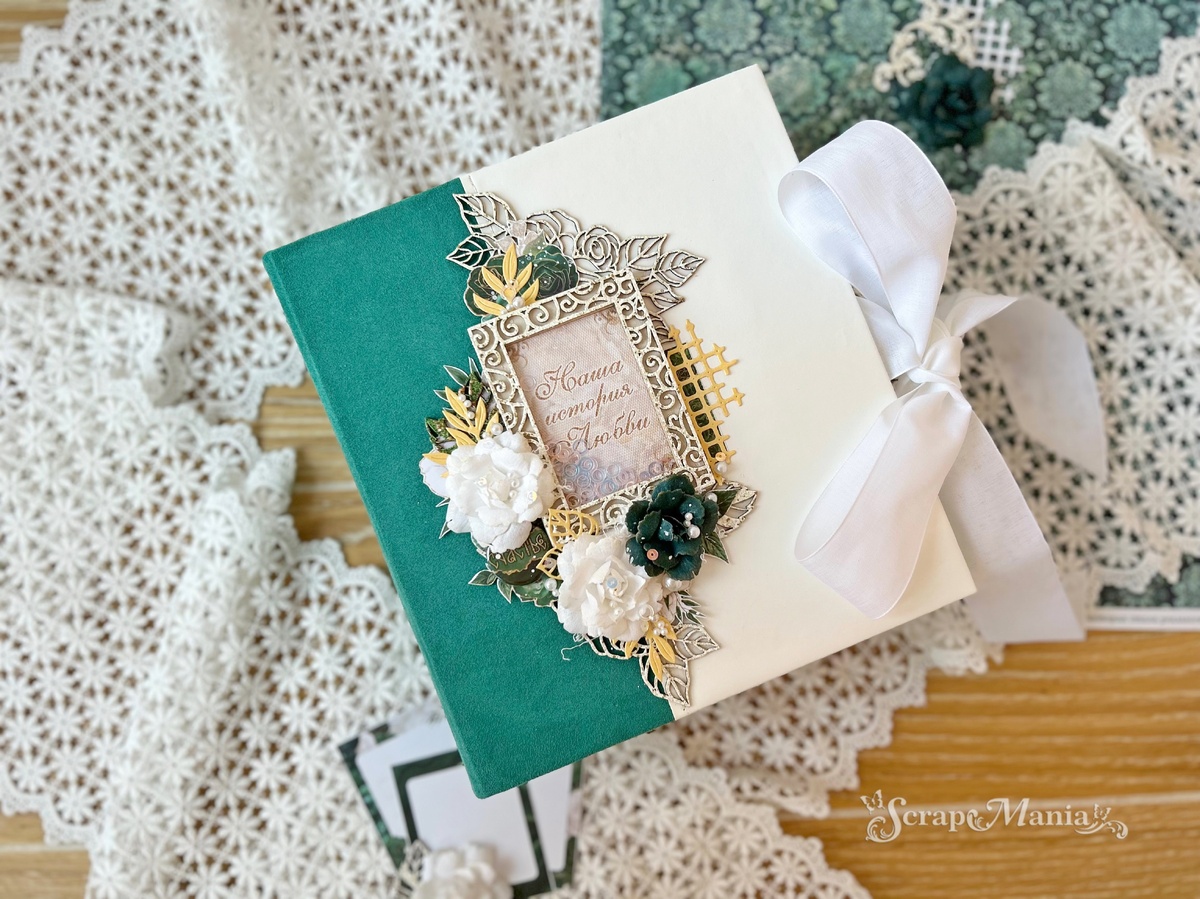 В обложке я соединила 2 материала: белый кожзам вивелла и двухстороннюю замшу красивого изумрудного цвета. Закрывается альбом на хлопковую ленту. Центральным элементом обложки является тканевая карточка "Малахитовый цветок. Наша история", которую я поместила в шейкер "Фономикс. Новогодний. Ажурная рамка маленькая." В композицию обложки замечательно вписались вырезанные элементы с листов для врезания "Малахитовый цветок. Розы", и вырубка ножами "Старая решетка", "Веточка с листьями 2", "Листья яблони 2", и замечательная фишечка из набор фишек "Малахитовый цветок". Завершающим акцентом служит набрызг, жемчужные бусины и пайетки.