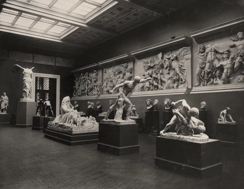В полном ходу идет расстановка скульптур Пергамского зала. Часть горельефов алтаря Зевса заняла уже целую продольную стену, левую от входа с главной лестницы. Другие части переносим на заднюю стену и на заднюю часть правой стены. Для скульптур иных памятников того же города заготовляется и архитектурное окружение. Художественно исполненная балюстрада верхнего яруса одной галереи обещает быть очень эффектной. Ионические колонны этой галереи, сохранившиеся в нижних своих частях, числом 4, отольет нам Гладков по имеющимся точным рисункам. Тогда балюстрадные плиты с их скульптурными изображениями получат смысл и ясность для посетителей. Еще больше об Иване Цветаеве и об архитекторе музея Романе можно узнать на экскурсии «Архитектурные фантазии Клейна». 🖼Зал эллинизма. 1912 год.