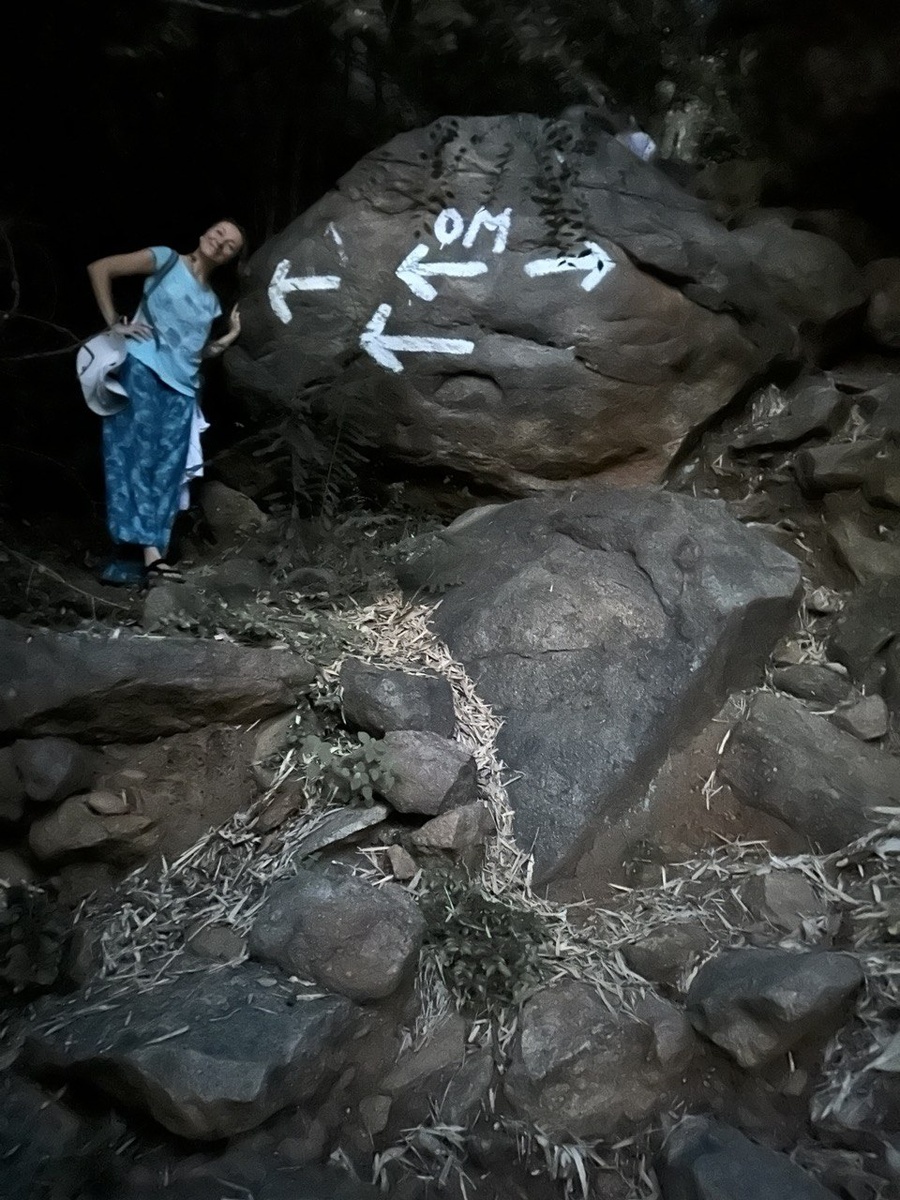 Четырьмя молчаливыми тенями путницы начали восхождение задолго до рассвета. Дождавшись проводника в назначенном месте, они были несказанно рады тому что Индус , похожий больше на лесного духа нежели на человека, вручив заветную папку и сказав что у него много дел, растворился в тенях ближайших деревьев. Мы начали свой путь от «первой пещеры Раманы Махарши», в которой просветленный жил и медитировал долгое время. Дорога менялась и петляла, местами указатели проставленные заботливым гидом терялись и приходилось возвращаться. В полной темноте они шли по огромным валунам Аруначалы. Это простое восхождение на небольшой казалось бы холм, местами превращалось преодоление потому что она шла босиком ( она отдала свои мягкие удобные тапки подруге, у которой были стерты в кровь ступни после вчерашней прадакшины, а сандали подруги ей натирали), и разбросанные иголки растений, веточки и мелкие камни доставляли массу ощущений в этом ночном странствии. Иногда они останавливались что бы передохну