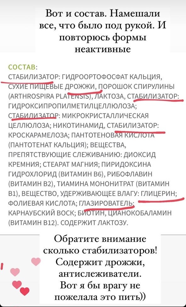 Давайте разберем составы некоторых БАДов: В составе на первом месте сироп агавы, вода, фруктоолигосахариды- это САХАР Минералы в виде глюконатов- это самый низкодоступный вариант, витамины не указаны в каких формах, а значит в неактивных. Низкие дозировки витаминов и минералов, что не обеспечит нужный терапевтический эффект Формы все неактивные и с самой минимальной биодоступностью, дозировки очень низкие-указано на две таблетки. Ещё наполнитель, антислеживатель, глазирователь. Это тоже ни разу не про пользу В составе Алюминий-нейротоксин! Даже минимальные дозы вредны. Есть много исследований о взаимосвязи отравления алюминием и риском развития болезни Альцгеймера. Можно было бы сказать,что есть кремний,который выводит алюминий, но он тут в совсем мизерных количествах Нутрилайт это бренд эмвэй. Я не верю, что фирма выпускающая порошки, использует качественное сырье для бадов. Цена недешевая с учетом низких дозировок и неактивных форм витаминов в составе. Обратите внимание с