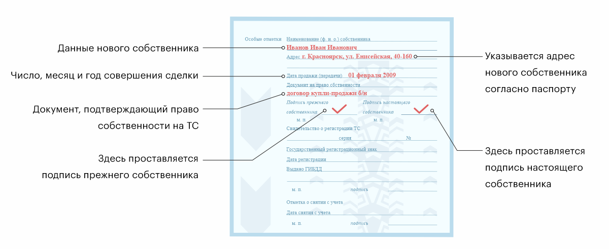 - Зачёркивания, исправления и помарки не допускаются. Если вам необходимо внести изменения, например, при указании нового собственника, сделайте это в графе «Особые отметки» и заверьте подписью.