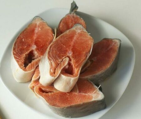 - Очищенную горбушу без головы я режу на порционные кусочки.