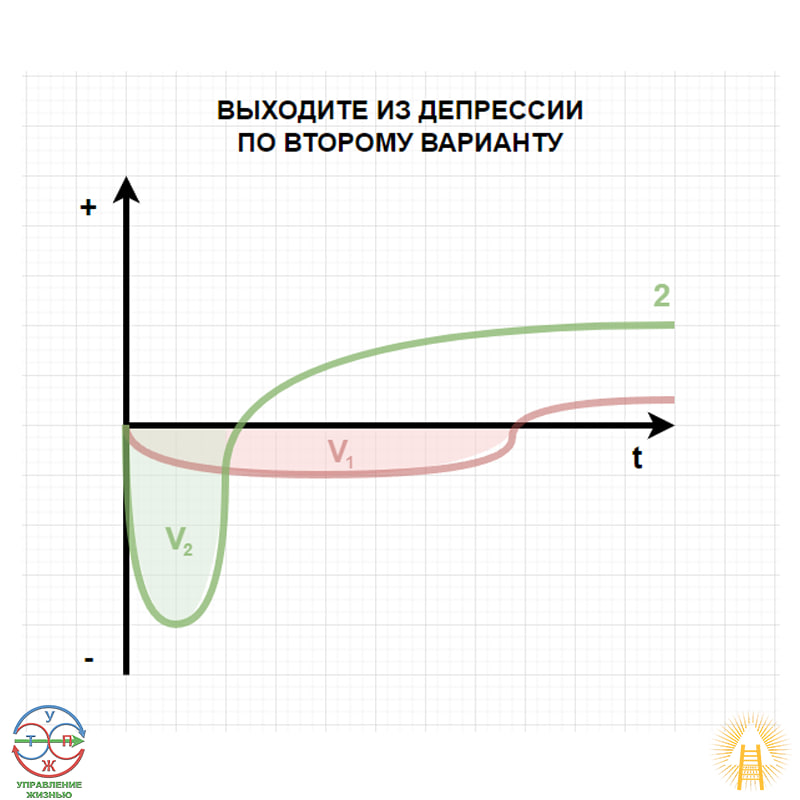 Если хочется пожалеть себя, пострадать, полениться, позаниматься ерундой — жалейте, страдайте, ленитесь, занимайтесь! ⚠️ Внимание! — Только сделайте это, как следует! ☝️ Вдоволь пожалейте, пострадайте, поленитесь, позанимайтесь ерундой. Насладитесь этим сполна. Зачастую люди пытаются бороться с унынием, чем только растягивают это состояние во времени. Это состояние всё равно возьмёт своё. Объём V1 и V2 одинаковый, но выход в плюс по варианту 1 занимает гораздо больше времени. Поэтому лучше погрузиться глубоко в эмоцию и прожить её интенсивно, чем вялотекуще, тогда эта эмоция быстро насытится и пойдёт обратное колебание маятника. Это похоже на алгоритм экстремального управления автомобилем на скользкой дороге: