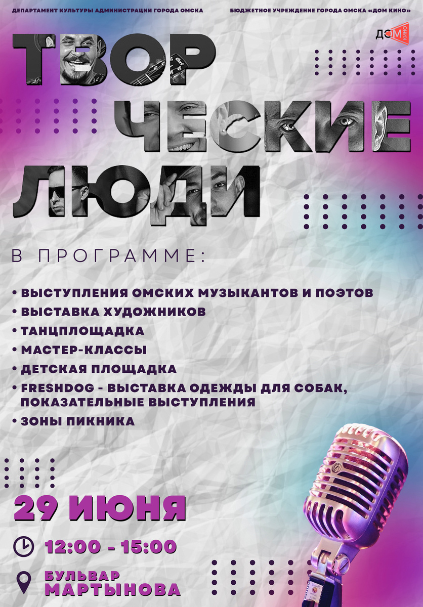 29 июня с 12 до 15 часов на бульваре Мартынова вновь пройдет летний пикник «Семейный. Творческий. На Мартыновском!». На основной сцене бульвара стартует большой концерт талантливого содружества «Творческие люди». Это профессиональные артисты и любители, певцы и музыканты, поэты и чтецы, битбоксеры, художники и те, кому есть чем поделиться со зрителями. На аллее будет работать выставка омских художников и мастер-классы, где можно попробовать себя в правополушарном рисовании, научиться работать с керамикой и изготовить бесконечную открытку.