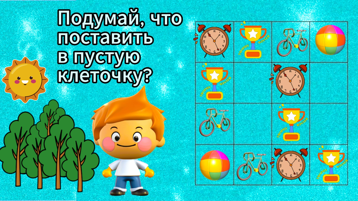 Вместе с нашими героями, вы можете совершить волшебное путешествие в страну магических квадратов! Вас ждут загадочные таблицы! Их нужно правильно заполнить, подобрав нужный рисунок, цифру или букву, так чтобы они не повторялись ни по горизонтали, ни по вертикали. Старайтесь справиться с этим заданием сами, без помощи мамы и папы.