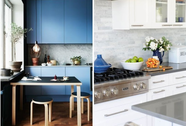 Темно-синие кухонные шкафы c черными мраморными фартуком и столешницей. Они украшают кухонное пространство и явно заставляют понять, что у владельца кухни есть вкус.