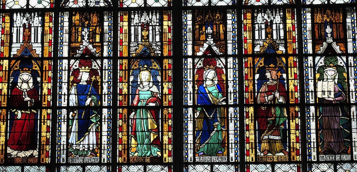 Кстати, вот очень интересный витраж наваррских королевской семьи в Соборной церкви Нотр-Дам в Манте. Слева направо – Жанна I, Филипп III, Жанна II, и вот четвертой следует как раз Жанна Д’Эвре. За ней уже Карл Злой и крайняя справа, судя по всему, Бланка Д'Эвре, королева Франции, вторая жена Филиппа VI Валуа.
