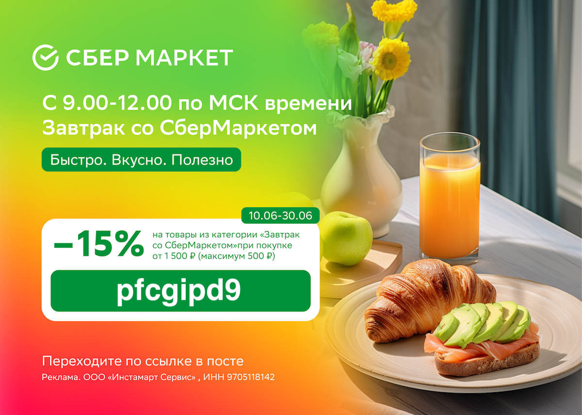 - pfcgipd9p – скидка 15% на товары из категории "Завтрак со СберМаркетом" (фактически это продукты и готовые завтраки из Самоката) при покупке от 1500 ₽ (максимальная скидка 500 ₽).