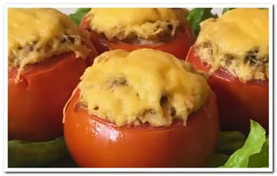 Запеченные помидоры получаются необыкновенно вкусными, сочными, ароматными, готовятся просто, но требуют чуточку терпения и старания. Ваши родные непременно по достоинству оценят ваше кулинарное творение. Для приготовления фаршированных помидор в духовке нам потребуются следующие ингредиенты: Отварим куриное филе в подсоленой воде до готовности, выложим на тарелку и отставим в сторону остывать. Теперь подготовим луково-грибную поджарку, а для этого: В сковороду нальем растительного масла и обжарим лук, пока он не размягчится и не станет полупрозрачным К луку добавим грибы, перемешаем и начнем обжаривать их вместе Жарить будем до тех пор, пока не испарится влага, и грибы начнут поджариваться Пока поджаривается начинка для фаршированных томатов, которые мы будем запекать в духовке, разделаем уже остывшее куриное мясо на мелкие кусочки. Измельченную курицу выложим в глубокую миску, к мясу добавим грибы, выдавим чеснок. Сюда же на мелкой терке натрем немного сыра, чуть меньше половины.