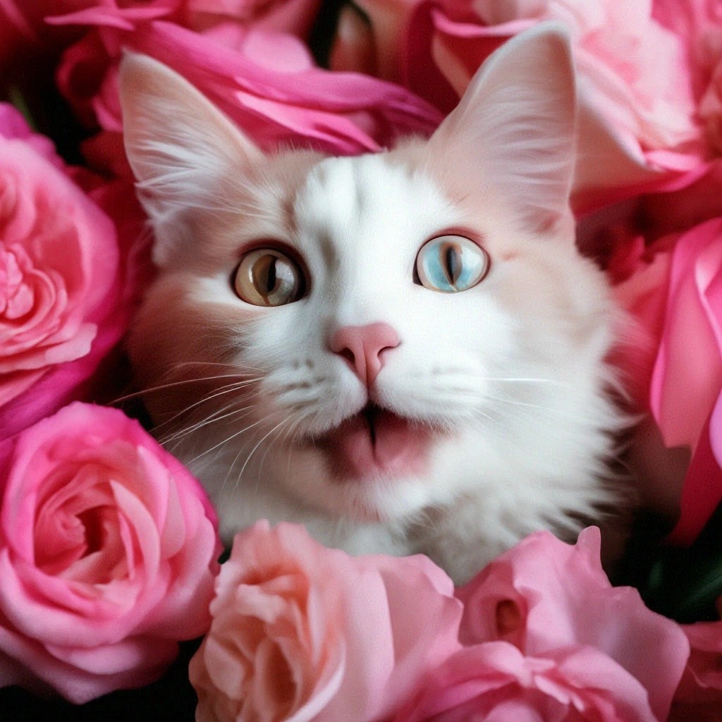 счастливый милый кот с разноцветными глазами, крупный план, в розах