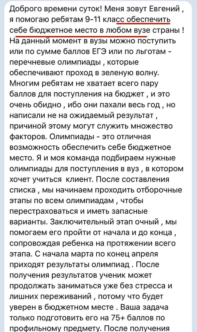 Недавно у коллеги репетитора в канале появился очень интригующий пост. Она обещала, что информация, которую сейчас расскажет, шокирует сильно всех. И ожидания не оправдались. Никогда не знал, что у нас покупают даже места на олимпиадах. Обо всем по порядку. И хочу сказать, что статья издана не с целью распространить данные нелегальные способы, а чтобы вы знали и понимали, что ни в коем случае так поступать нельзя! Лучше сами учитесь, сами готовьтесь и будет легально и полезно. Надеюсь, вы все поняли. Вот такой пост с предложением сотрудничества выложила коллега в своем канале: Если вы еще не поняли до конца, что предлагает данный авантюрист, так это предложить написать олимпиады по предметам, которые нужны для поступления, целиком и полностью за учеников. Насколько же несправедлив мир! Конечно же, коллега отказалась от данного предложения, так как это, как минимум, нелегально. Ну и я ,в принципе, в шоке от того, что могут быть такие репетиторы, учителя, которые вообще на это согласятс