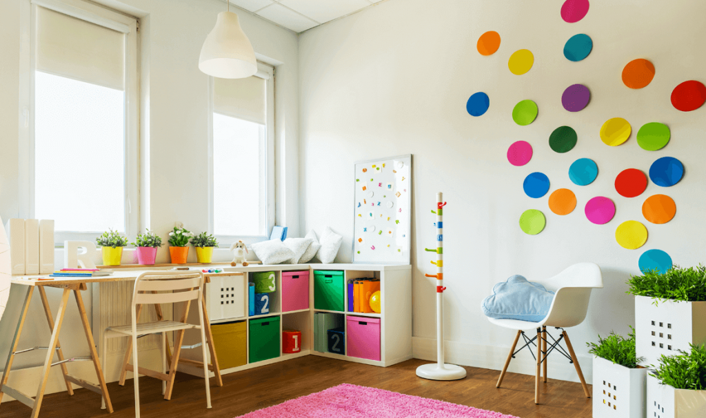 Здесь важна безопасность и возможность для творчества. Мягкий ковер, ящики для игрушек, полки для книг и настольных игр создадут уютную и организованную атмосферу.