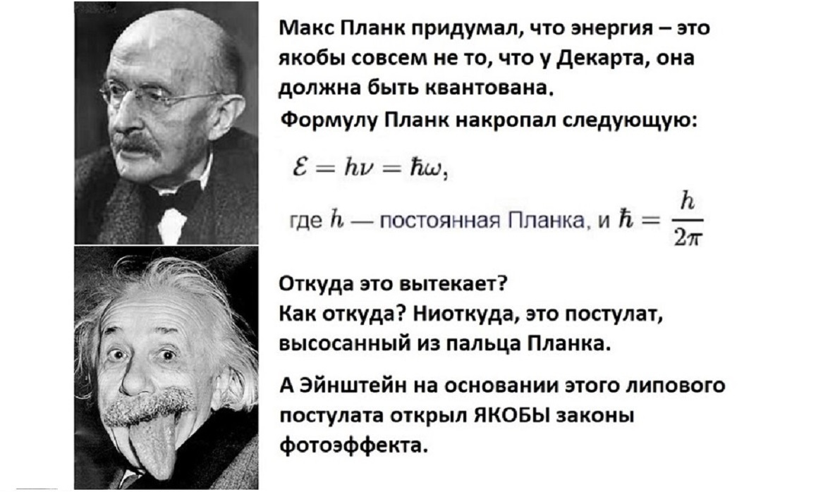 Вот нарисовался Макс Планк и придумал, что энергию излучения надо квантовать. Формулу Планк накропал следующую Е = h ню. Откуда это вытекает? Как откуда? Из ниоткуда, это постулат, высосанный из пальца Планка. А Эйнштейн на основании этого липового постулата открыл якобы законы фотоэффекта.