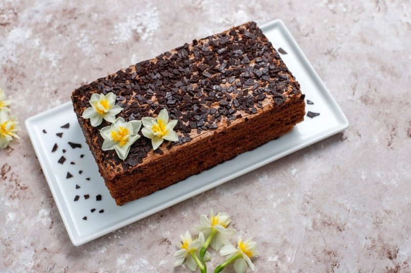 Достаем торт из кондитерского кольца и посыпаем шоколадной крошкой.