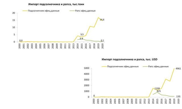 С 2013г. высокими темпами растет импорт семян подсолнечника в Таджикистан, при этом с 2019г. объемы импорта стали превышать объемы внутреннего производства подсолнечника. В 2020 году Таджикистан импортировал 14,6 тыс.тонн семян подсолнечника. Объемы импорта семян рапса незначительны по сравнению с объемами импорта других культур. Максимальный объем импорта отмечался в 2015г. (2,3 тыс.тонн), но в последующие годы объем импорта семян рапса стал сокращаться и в 2020 году составил 136 тонн.