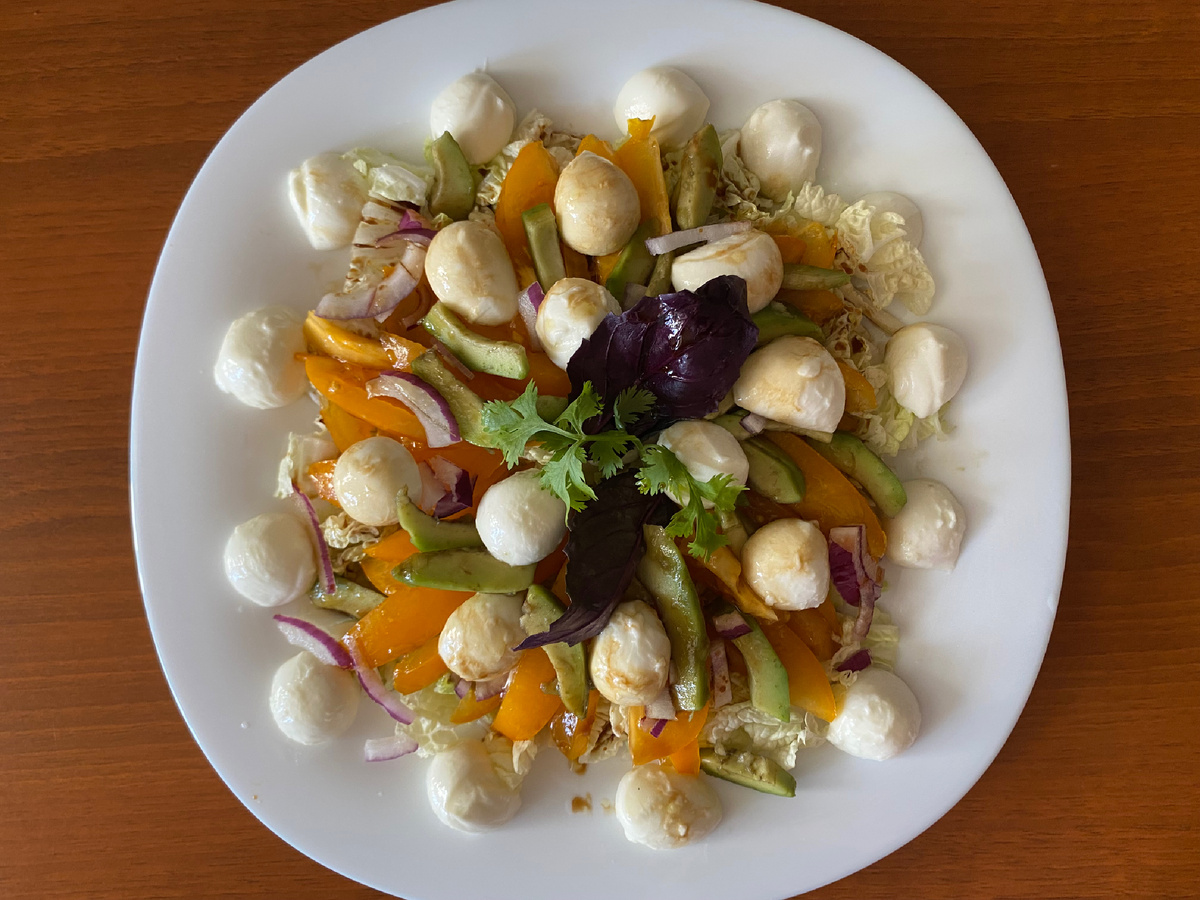 Витаминные салаты из свежих овощей не только очень полезны, но и способны украсить любой стол. Одним из самых полезных продуктов питания является авокадо 🥑.Его регулярное употребление снижает риск сердечно-сосудистых заболеваний, сахарного диабета ,помогает укрепить иммунитет, замедляет старение организма. Поэтому употребление в пищу авокадо 🥑 просто необходимо . Интересное сочетание пекинской капусты, помидор и авокадо делает салат вкусным и полезным. Заправка и моцарелла придает блюду особенный вкус. Авокадо - 🥑 1шт. Желтые помидоры -4 шт. Моцарелла -120гр. Красный лук-0,5 шт. Пекинская капуста 🥬 3лист. Для заправки: Соевый соус-3ч.л. Оливковое 🫒 масло-1ч.л. Бальзамический уксус-0,5ч.л.
