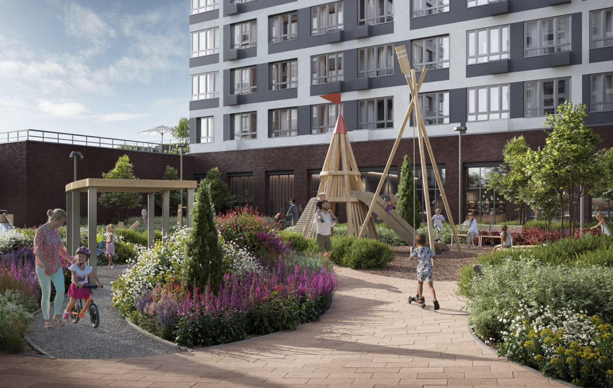 Выбрать квартиру в ЖК «Родные кварталы» В дизайне, цветовых и пластических решениях используются элементы декоративно-прикладного искусства разных народов России, традиционные орнаменты. Во дворах и на открытых пространствах появятся специально оборудованные зоны народных игр. Например, в городской гостиной жилого комплекса будут устроены площадки для татарской народной игры «Кучтем-куч» (Скок-перескок). Она развивает вним