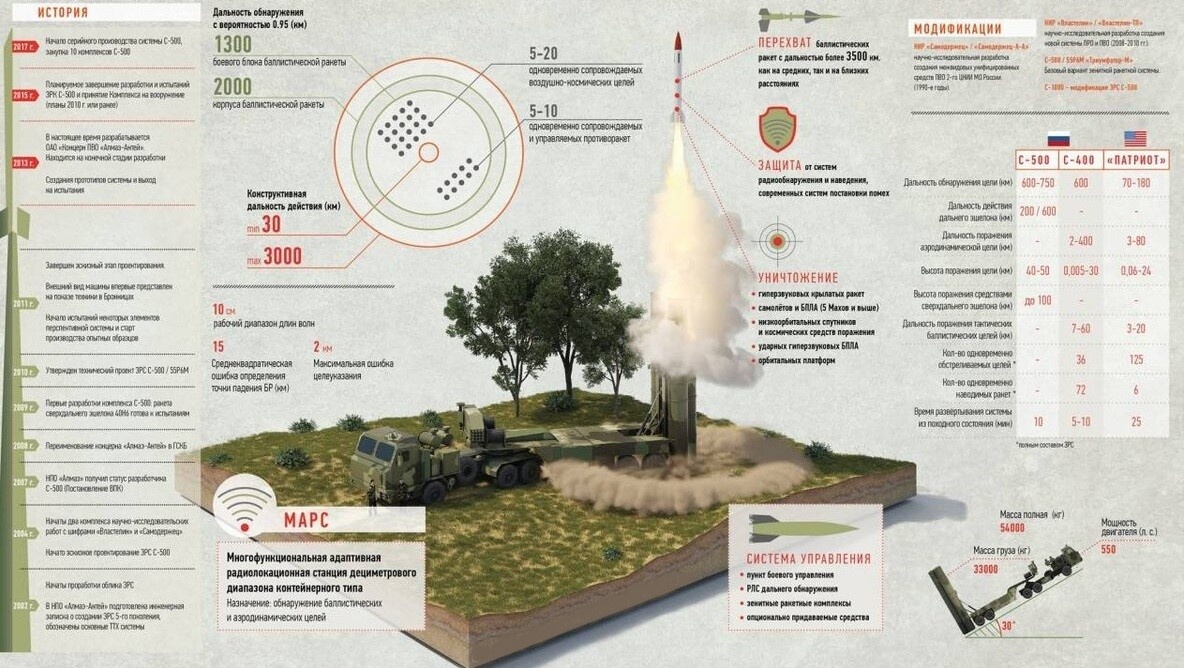 «“Прометей” завершил серию испытаний, подтвердив способность сбивать гиперзвуковые цели. Последний этап испытаний комплекса С-500 прошел 22 февраля, когда «Прометей» поразил межконтинентальную баллистическую ракету Р-29РМУ2 “Синева”. После этого было объявлено, что в войска он пойдет в этом году».