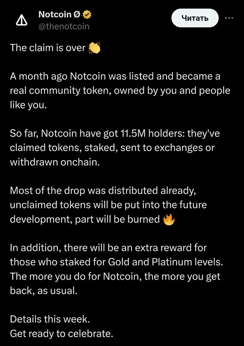 Клейм окончен, кто забыл получить свои $NOT — облажался и потерял свой аирдроп (часть монет сожгут, часть заберут на развитие приложения)