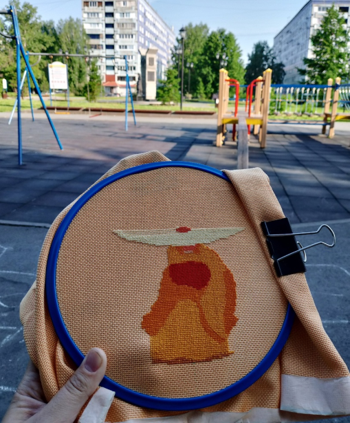 Вышиваете в жару? Конечно, у кого-то может быть установлен кондиционер, у кого-то окно выходит на северную сторону, а вот в моё окно солнце натуральным образом восходит, просыпаюсь я часов в 5 утра, рискуя запечься в этой духовке... Так что я открыла сезон вышивания на лавках. В этом году впервые, потому что это мои первые жаркие выходные дома. В другие дни или не было так душно, или я шла на работу. В эти же субботу и воскресенье мне было необходимо где-то переждать примерно час до открытия тренажёрного зала. Можно было бы просто пройтись, но я решила попытаться за это время наверстать упущенное в вышивке. И пошла посидеть в теньке на ближайшей детской площадке. Чтобы вышивать на улице, нужен максимально удобный набор, такой, в котором не придётся постоянно сверяться со схемой. Мне нравятся китайские с нанесённой на канву схемой, но сейчас у меня в ходу такого нет. Зато есть другой "китаец", точнее, "китаянка". Здесь тоже почти не нужно сверяться со схемой, только, когда подходишь к к