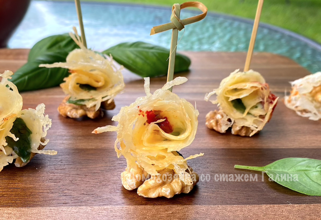 Можно подать на ломтике хлеба или сделать закусочные розочки на шпажках.
