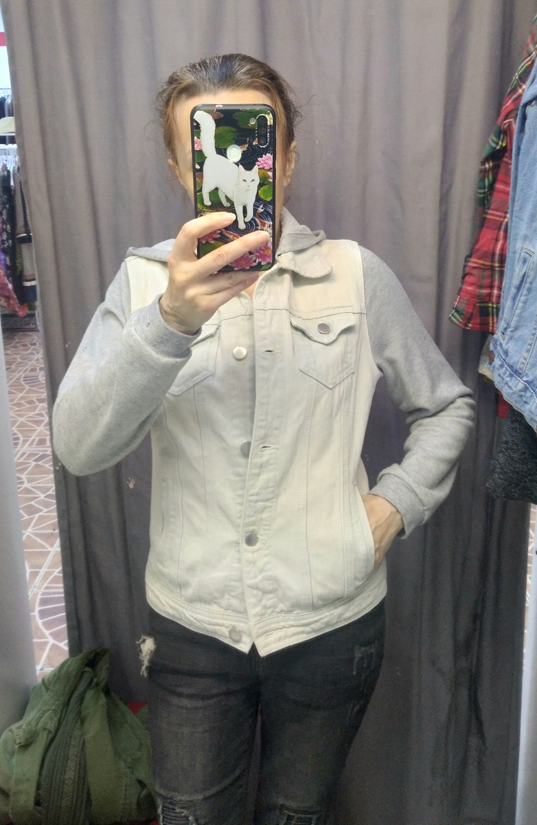 Здравствуйте. Какой сильный дождь был с воскресенья на понедельник, я сплю как сурок, я могу и апокалипсис проспать, а тут проснулась от шума и дождь за окном просто стеной. Думала, что наш дачный домик (вместе с мужем) смоет в канал и он торжественно вплывёт в москву-реку. Но зря волновалась, разница в 40 км и там чуть поморосил)), всё вылилось на нас. Обзор из Столичного гардероба, всё можно было купить со скидкой 50%, цены как всегда пишу полные. Белая джинсовка с серыми трикотажными рукавами и капюшоном. Хлопок. Косуха из хлопка, ткань плотная вроде джинсы. Не часто найдёшь косуху в клетку. Косуха из искусственной замши терракотового цвета на леопардовой подкладке. Gerry Weber, почти 2 тыс. 2200 руб. Прямой однобортный жакет светлого кремового оттенка, совершенно классическая модель. Вискоза и синтетика. 3 тысячи, а дорогая нынче шерсть, такое впечатление, что собирают её с огромными опасностями для жизни и продают на вес золота. Я один раз в живую видела как стригут овец и вроде