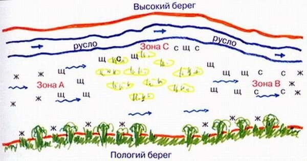 Пятаками» называют характерные песчаные отмели на довольно больших реках Центральной России, таких как Ока. Возникают они в результате гидрологических процессов, происходящих на участках реки с течением от среднего до сильного. В начале лета, после весеннего половодья, «пятаки», как правило, скрыты водой, никакой растительности на них нет. Глубина над ними бывает разная, в среднем около метра, дно песчаное. Они представляют определенную опасность для моторных лодок, хозяева которых незнакомы с правилами плавания по рекам и знаками навигации. Также следует иметь в виду, что в начале лета песчаное дно на «пятаках» еще не успело равномерно уплотниться и встречаются участки с тонким верхним слоем песка. При ловле в забродных штанах этот слой какое-то время может держать рыболова, а потом ноги начинают уходить в песок и вязнуть («эффект зыбучих песков»). Поэтому нужно быть предельно внимательным и следить не только за рыбой, но и за дном. В середине лета уровень воды в реке входит