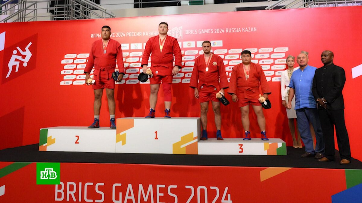 [ Смотреть видео на сайте НТВ ] Сборная России является лидирующей в Играх стран БРИКС. С начала международных соревнований спортсмены завоевали 239 медалей. В Казани продолжаются спортивные игры стран БРИКС. За пять дней соревнований в копилке российской сборной — 239 медалей, почти половина из них — золото. В активе самбистов — семь наград высшей пробы. Также российские атлеты отличились в спортивной гимнастике и ушу. Традиционно свое право на золото отстояли и синхронисты. А сборная России по гребному спорту и вовсе стала лучшей на этих играх, завоевав 13 золотых, 7 серебряных и 2 бронзовых медалей. Накануне стартовали соревнования по легкой атлетике. В первый день были разыграны награды в 21-й дисциплине. Российская команда по-прежнему лидирует в общем медальном зачете. Второе место занимает Белоруссия. (19 золотых, 36 серебряных, 39 бронзовых). На третьем — спортсмены из Китая. (17 золотых, 11 серебряных, 8 бронзовых). [ Смотреть видео на сайте НТВ ]