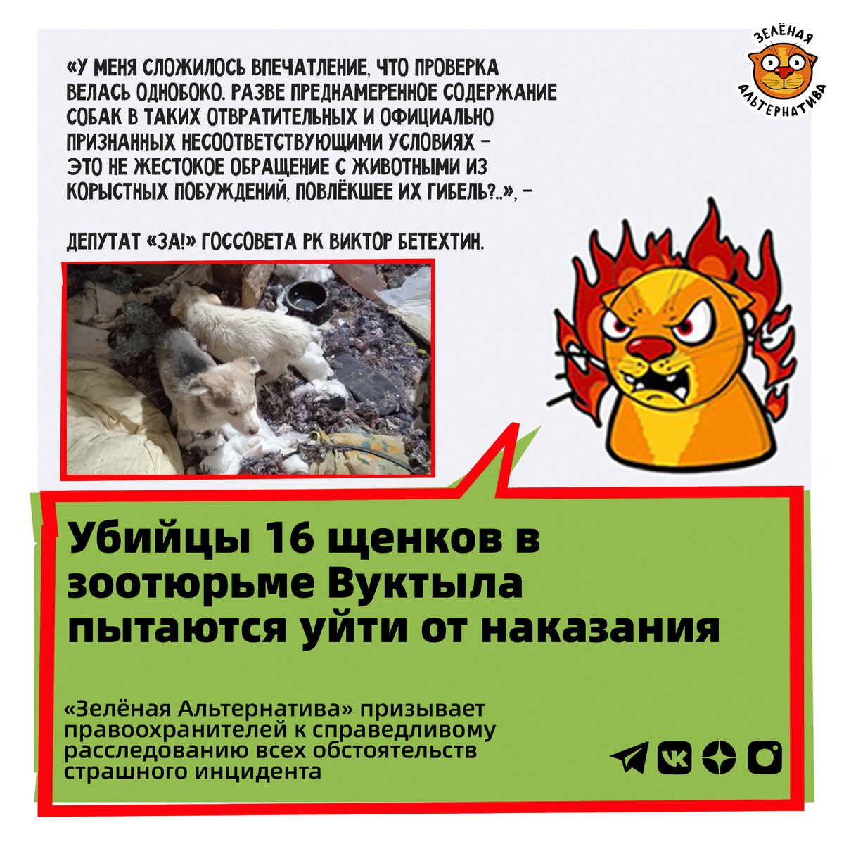 В прошлом году мы рассказывали о гибели собак в недостроенном муниципальном зооприюте города Вуктыла Республики Коми (РК). Во время новогодних праздников там насмерть замёрзли 16 собак из-за того, что условия содержания мало отличались от концлагерей. Наша соратница и общественный инспектор Екатерина Каменских ездила в этот большой сарай для фиксации всех нарушений, а депутат Госсовета РК Виктор Бетехтин писал депутатский запрос в региональную прокуратуру с призывом осуществить проверку Вуктыльского шелтера. Республиканские прокуроры подтверждают, что в ходе выездного мероприятия они установили большинство из ранее зафиксированных Каменских нарушений.