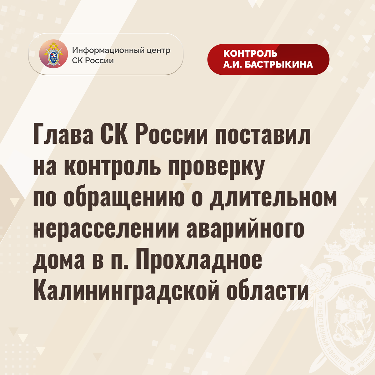 Глава СК России поставил на контроль проверку по обращению о длительном нерасселении аварийного дома в п. Прохладное Калининградской области