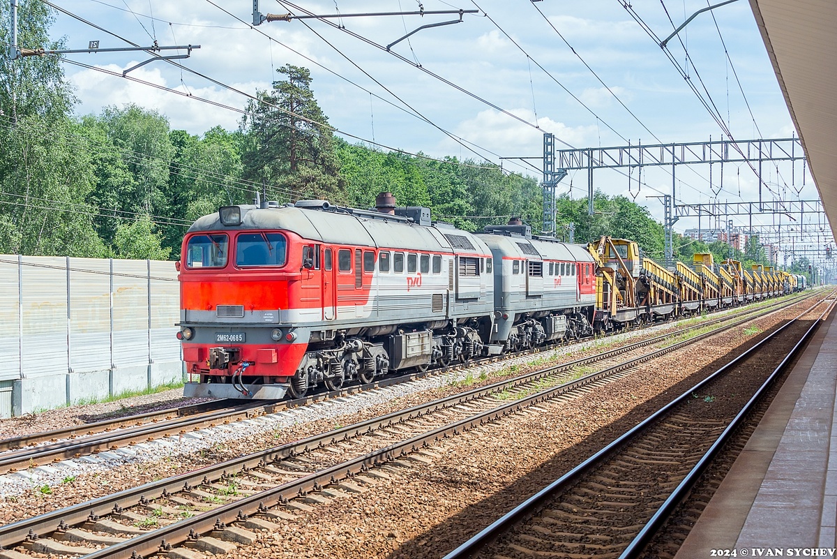 Сейчас, летом, на главном ходе Горьковского направления решили поменять третий и четвертый пути. И в выходные дни всякой дорожной техники, составов с щебнем, локомотивов и вагонов очень много. Вот про эти самые моменты, точнее про часть из них, что-то (и много) прошло мимо. 1-2. Традиционно, мой маршрут начался на остановочном пункте Ольгино, возле которого стоял состав поезда для работ с полотном и балластом. Ну и «впряжен» в него был тепловоз 2М62-0685. 3-4. Неподалеку оказался стоящим хозяйственный поезд с тепловозом 2М62-1100. 5. А вот в Царицыно я встретил поезд с очень оригинальной сплоткой в голове: ВЛ10у-224 и 2М62, а вот с номером тепловоза не задалось, подобраться ближе не оказалось возможным. И все же, ни разу не встречал вот такой двойной тяги», думается, что и поезд и электровоз просто куда-то перегоняли (почему не уверен на 100%, потому что состав стоял и никуда не ехал) 6. В Царицыно в тот день вообще было любопытно с поездами. Вот этот состав с цистернами стоял на путеп