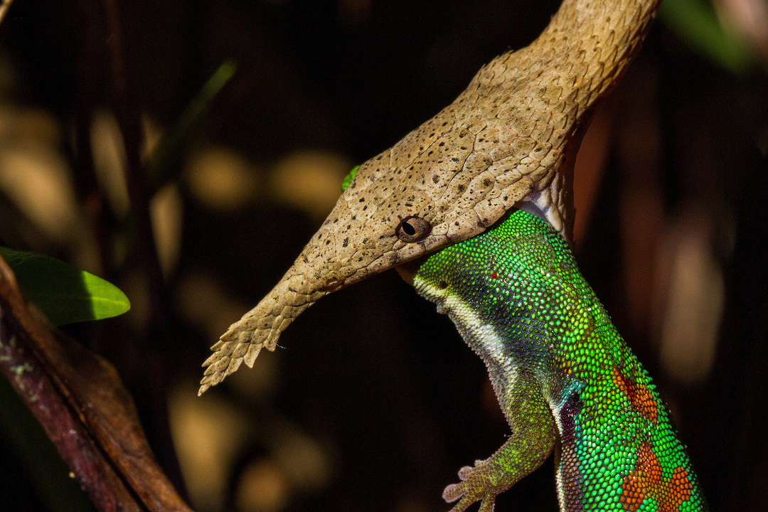 Привет, мои дорогие любители необычной земной фауны. Сегодня наш выпуск посвящён любопытной Варваре змее, у которой, пожалуй, самый длинный нос среди её сородичей. А вот зачем он ей – вопрос. Чтобы познакомиться с нашей сегодняшней героиней в реальности, нужно отправиться на самый край нашей галактики, в солнечную систему, на планету Земля. Там, среди лазурных вод океана, лежит благословенный остров Мадагаскар. Нам туда. Бродя по тропическому лесу этого острова, нужно быть очень осторожным, ибо змеи там буквально висят на деревьях. И если вы не фанат этих прекрасных существ, нужно глядеть в оба... Итак, знакомьтесь, если вы не знакомы – мадагаскарский листоносый уж (Langaha madagascariensis). Впрочем, это не вполне уж, в привычном понимании слова, так как ни к роду уже, ни даже у семейству ужеобразных он не относится. Данный вид имеет выраженный половой диморфизм (внешнее различие полов): самцы сверху коричневые, снизу жёлтые (на фото выше); самки серовато-бурого цвета (на фото ниже).