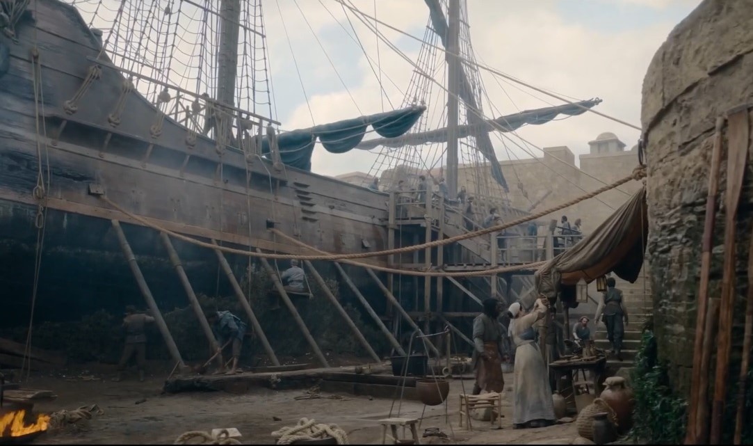 Далее – Дрифтмарк. На пристани Корлис беседует с неким корабелом, чернокожим крепышом лет тридцати на вид. Этот крепыш, оказывается, и спас Корлиса из пучины морской, ну, мало – проходной персонаж, подумал я вначале. Вот только сериал – не книга, чтобы тратить время на эпизодических героев. Как только произносится имя этого парня – Алин (еще мелькнуло, что у него есть брат) сразу стало ясно по какой версии решил идти сериал. Только как всегда, коряво. Но объяснить таковую необходимость, правда, можно. Итак, этот моряк Алин со своим старшим братом Аддамом , получается и есть отпрыски Корлиса Велариона, вот только здесь уже без вариантов – сыновья. Алин выглядит, как ровесник «убитого» несколько лет назад Лейнора, то есть, это его незаконнорожденный брат, а не сын.