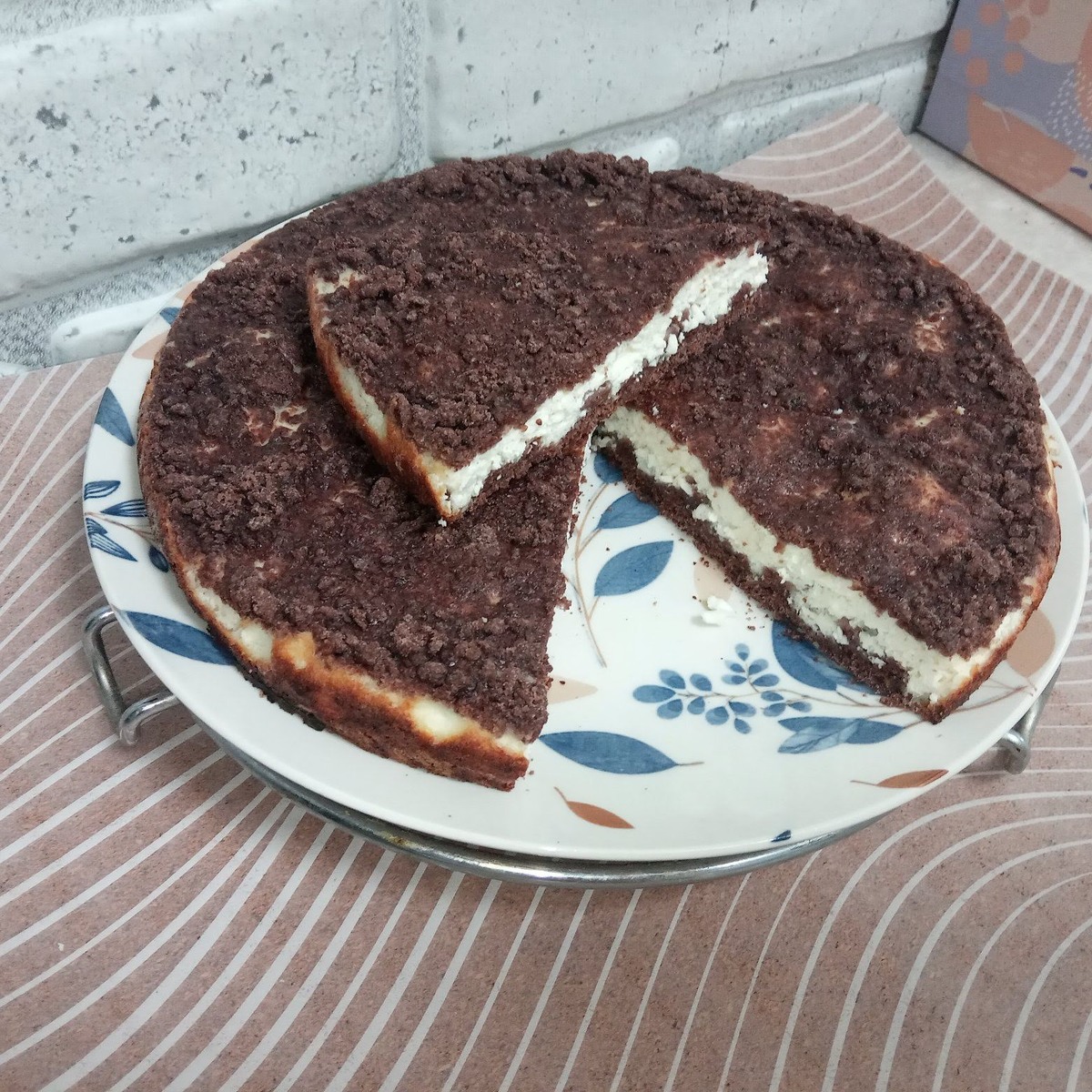 По сути это "Королевская ватрушка" с какао. Мы ее любим, частенько готовлю ее. В этот раз она получилась незапланировано, творог лежал долго в холодильнике и его необходимо было где-то применить, сын попросил ватрушку с какао, по типу Орео, ему очень нравиться в таком виде. Ингредиенты: творог 5% 200г яйцо СО 2шт сметана 15% 40г подсластитель 2г ванилин 8г масло сливочное 72,5% 40г какао порошок 10г мука ВС 90г сахарр 30г разрыхлитель 5г Сначала я готовлю заливку. Для этого творог и яйца, сахзам, ванилин перетираю в глубокой чаше. Вообще мне нравиться еще добавлять банан, но сегодня у меня его не было и творог обычно маложирный беру. К творожной массе добавляю сметану и хорошо перемешиваю. У меня творог брикетированный, если у вас крупнозерновой то необходимо пробить блендером или перетереть предварительно творог через сито. Далее готовлю тесто, для него необходимо масло достать из холодильника заранее чтобы оно стало мягким. В чашу выкладываю масло и оставшиеся сыпучие продукты, в те