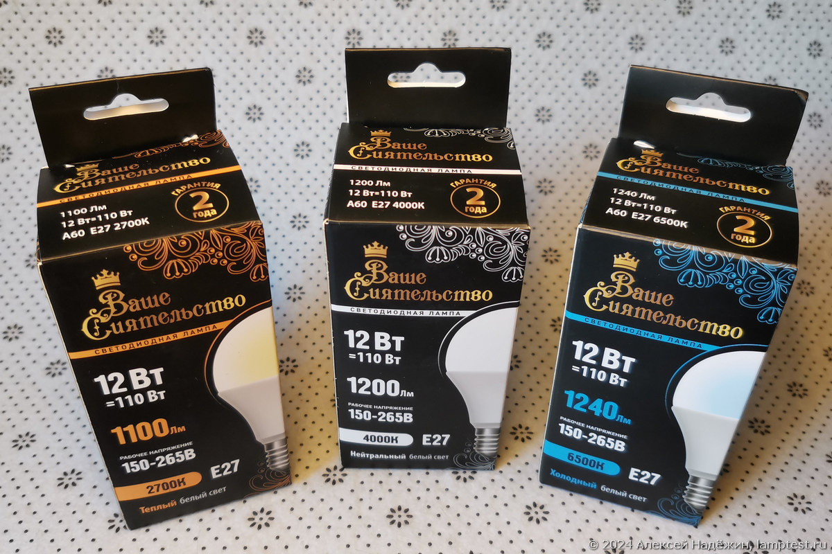 Екатеринбургская компания "Энергомикс", прославившаяся выпуском батареек с немного провокационным называнием "Тест на правду", выпустила лампочки с не менее необычным названием "Ваше Сиятельство" и слоганом "Светодиодная лампа с честными характеристиками". Я протестировал и изучил все 24 модели лампочек этого бренда. В презентации этих ламп утверждается, что все характеристики на коробке полностью соответствуют реальным, используется IC-драйвер, а также то, что светодиоды нагружены на 80%. На лицевой стороне коробок крупно указано, что лампы могут работать в диапазоне напряжений 150-265 В. Всего выпущено восемь моделей ламп ("груши" A60 E27 10 и 12 Вт, "свечки" C37 E14 7 и 5 Вт, "шарики" G45 E27 7 и 5 Вт, "таблетки" GX53 8 и 10 Вт) в трёх цветовых температурах - 2700K, 4000K, 6500K. Я протестировал все лампы. Как обычно, тестирование проводилось после тридцатиминутного прогрева с помощью полуметровой интегрирующей сферы, спектрометра-пульсметра Uprtek MK-350D и точного измерителя мощно