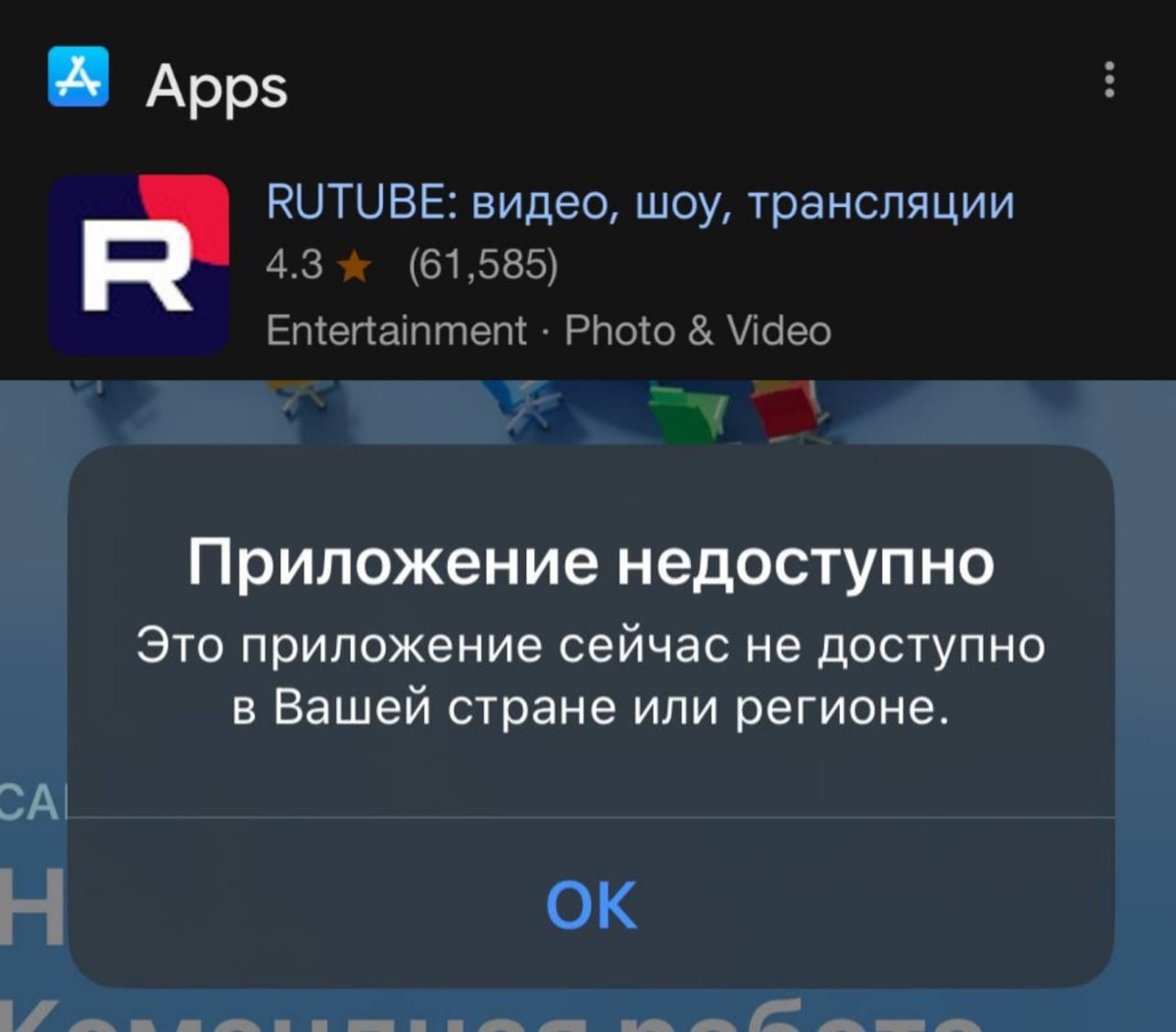 Уже установленное приложение Rutube для просмотра видео также невозможно обновить. Ранее Apple уже ограничивали установку приложение за границей России и требовали удалить видео от правительственных источников и пиратские публикации, но платформа отказалась убирать этот контент. В AppStore всё ещё можно установить детскую версию видеохостига и приложение для контентмейкеров. Rutube уже объявил, что будут «работать над решением проблемы».